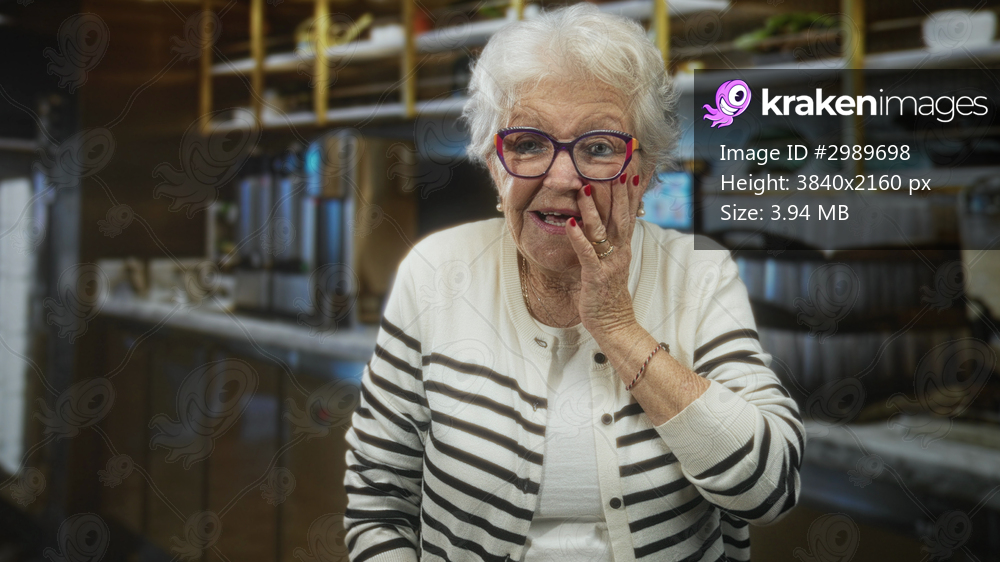 Senior woman touches cheek with hand near mouth in cafe kitchen, striped cardigan and glasses visible; surprise.