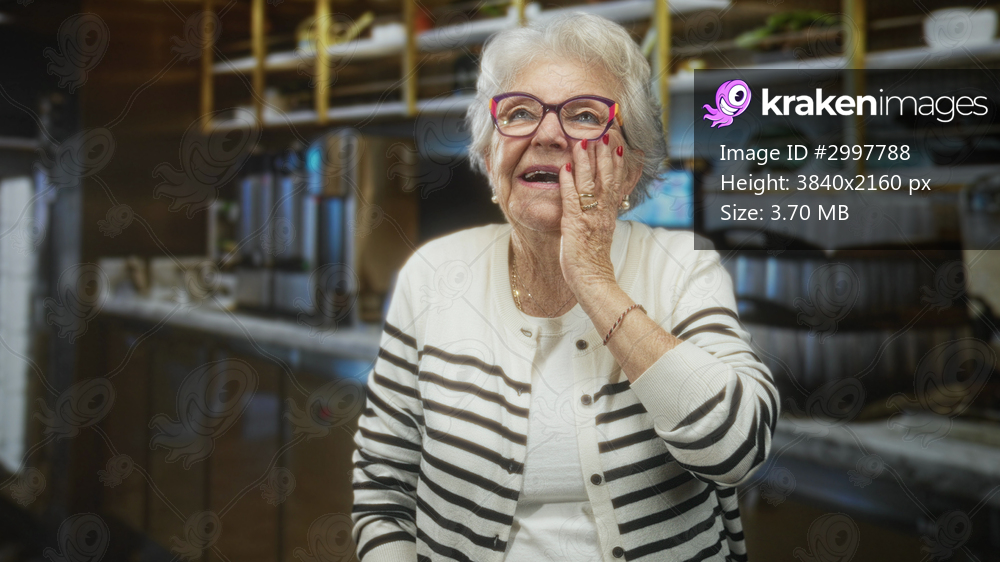 Senior woman touches cheek with hand near mouth in cafe kitchen, striped cardigan and glasses visible; surprise.