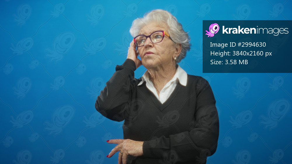 Senior woman touches temple with hand and crosses arms in studio blue backdrop wearing glasses and sweater; pensive reflection.