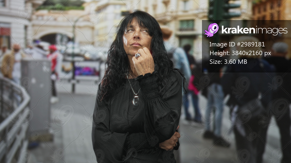 Senior woman touching chin with hand on a busy urban street crossing by trafficlight and crowds while gazing upward; contemplation.