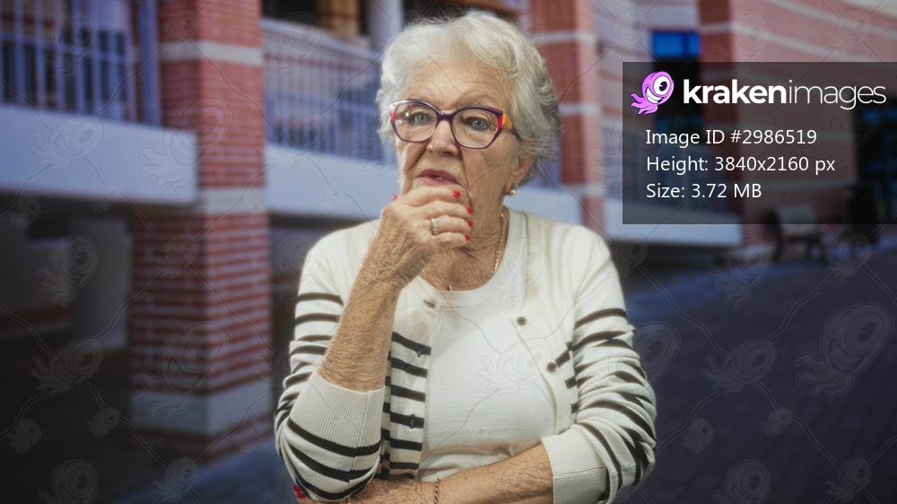 Senior woman touching chin with hand, wearing glasses in front of brick building; thoughtful reflection.