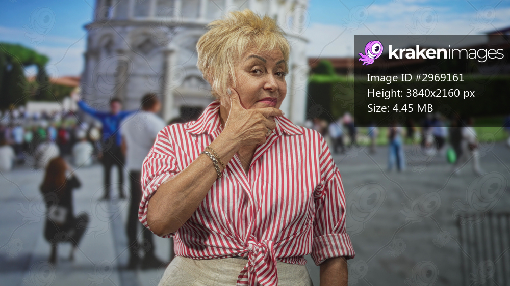 Senior woman touching chin in red striped shirt standing before building plaza with tourists and a leaning tower visible; pensive reflection.