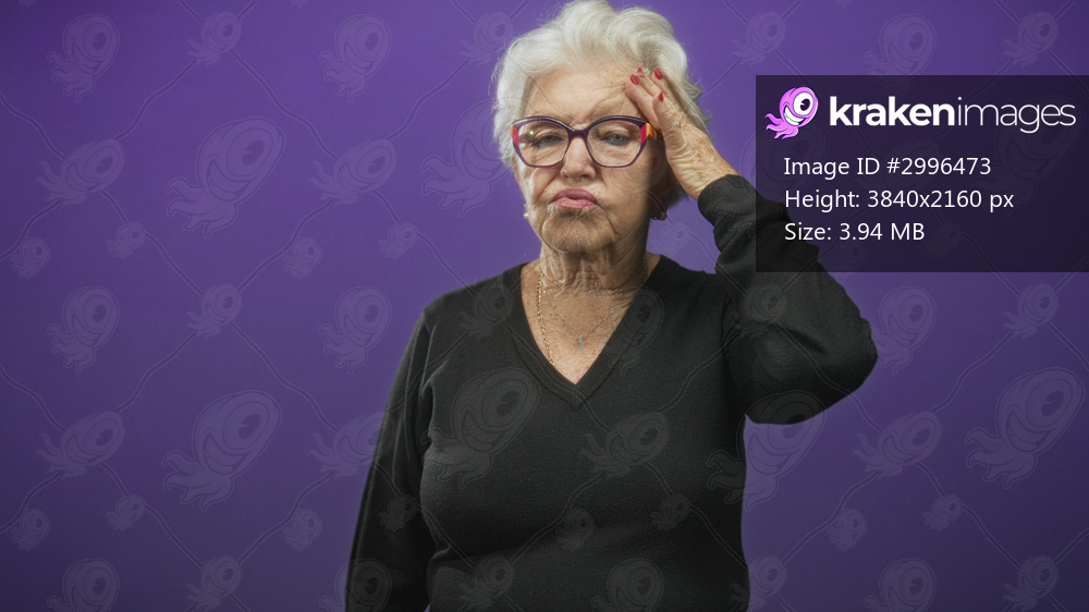 Senior woman touching forehead with hand, eyes closed, wearing glasses and black sweater in studio; fatigue reflection.