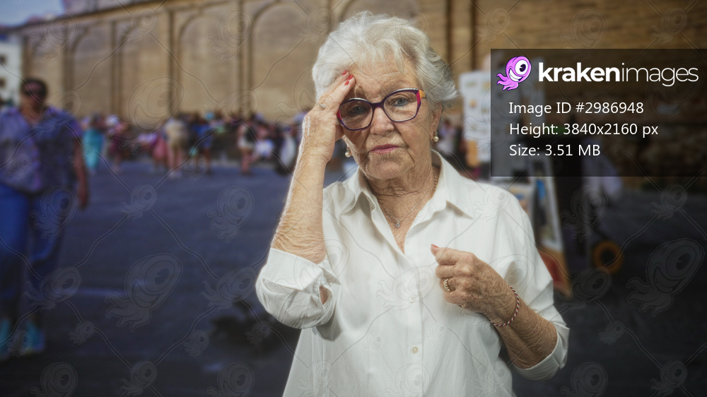 Senior woman touching temple and adjusting glasses on a crowded street market by a brick building; memory, fatigue.