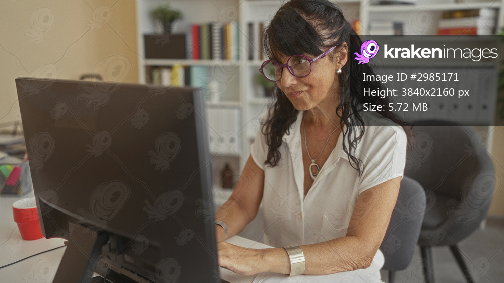 Senior woman typing on keyboard at a desktop computer in a modern office building, wearing purple glasses and silver bracelet; concentration productivity. - Kraken Images