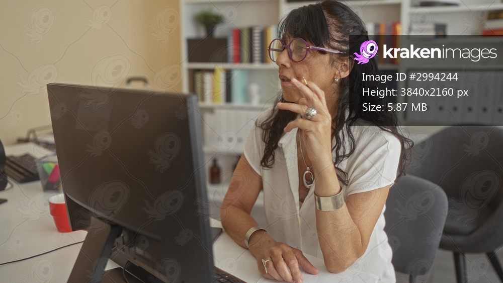 Senior woman typing on keyboard at a desktop computer in a modern office building, wearing purple glasses and silver bracelet; concentration productivity. - Kraken Images