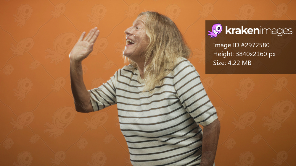 Senior woman waving hand and smiling, striped shirt visible in orange studio; friendly greeting joy.