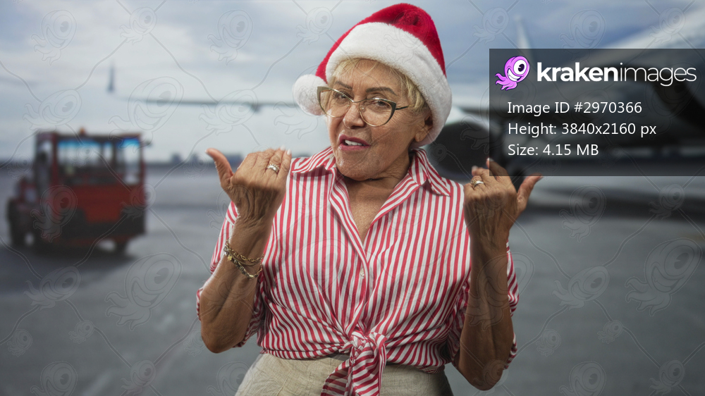 Senior woman wearing a santa hat points both fingers toward camera on airport tarmac beside airplane and ground vehicle; festive joy.