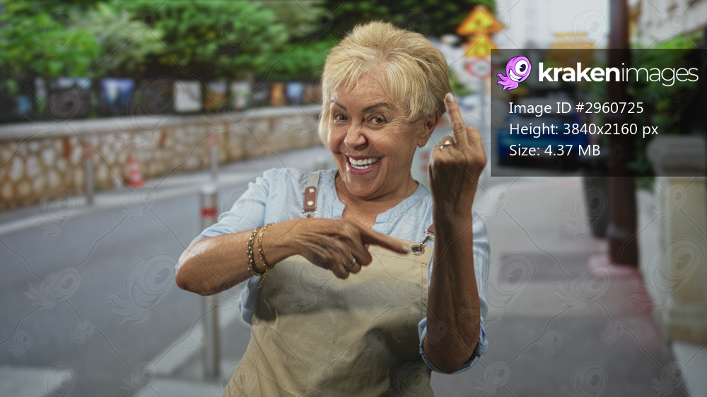 Senior woman wearing apron points finger to middle finger on street while smiling and showing rings and bracelets; playful defiance.