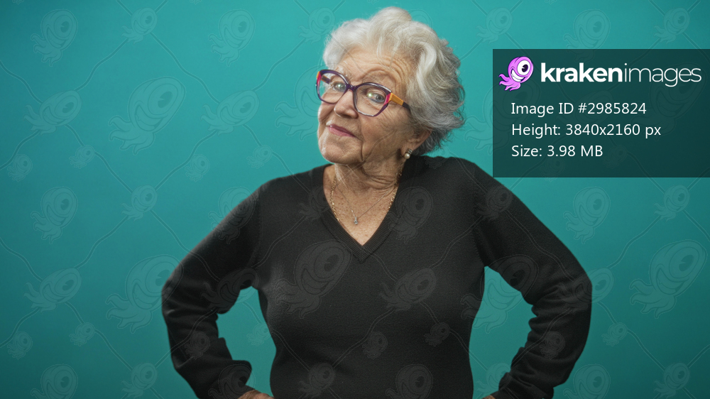 Senior woman wearing colorful eyeglasses and gold necklace, hands on hips with slight smile and head tilt against a teal studio backdrop; confidence.