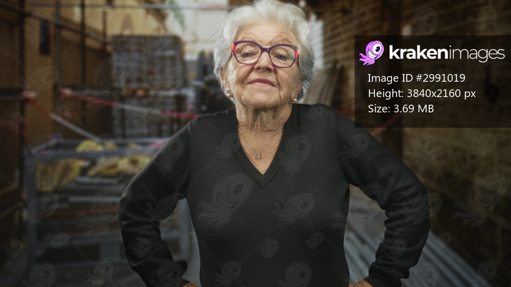 Senior woman wearing colorful glasses and necklace, hands on hips in an industrial building alley with pallets and pipes; confidence resilience.