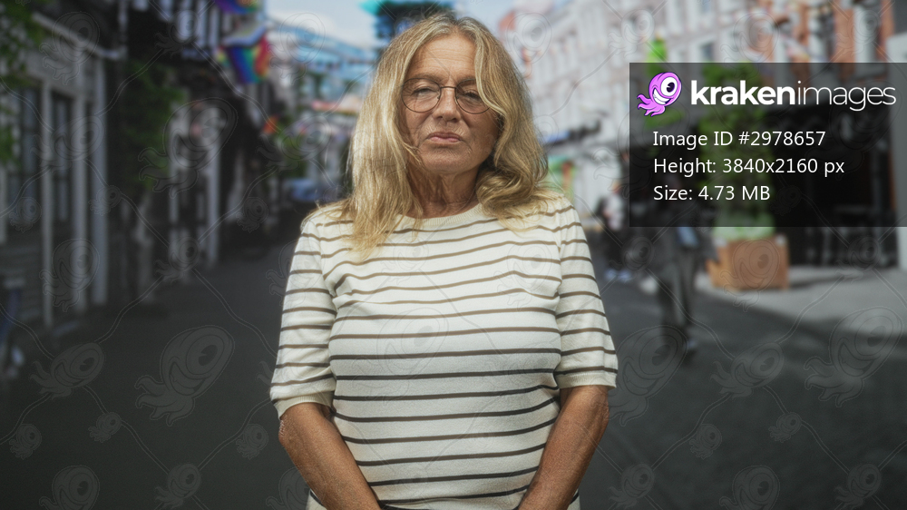 Senior woman wearing glasses and a striped shirt with head bowed and hands clasped on a street lined with cafes; quiet reflection.