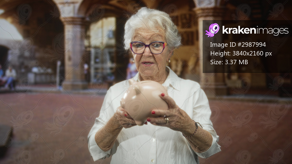 Senior woman wearing glasses carefully receives a ceramic piggy bank with both hands in a historic building arcade; surprise savings.