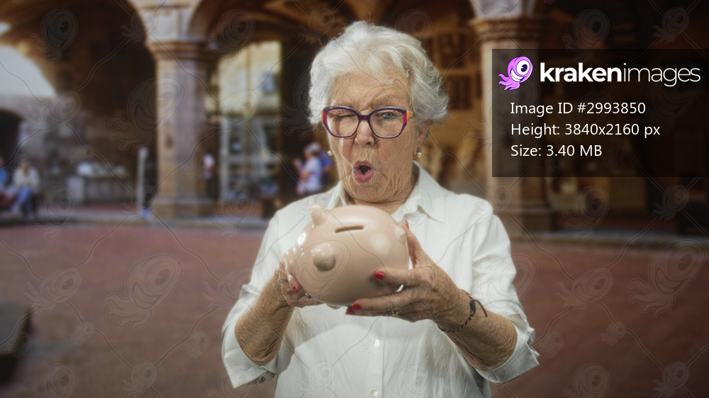 Senior woman wearing glasses carefully receives a ceramic piggy bank with both hands in a historic building arcade; surprise savings.