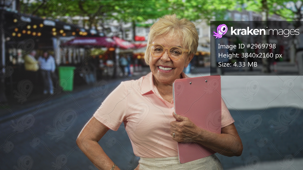 Senior woman wearing glasses holds a pink clipboard and shields her eyes with one hand while smiling on a busy street market; thoughtful reflection.