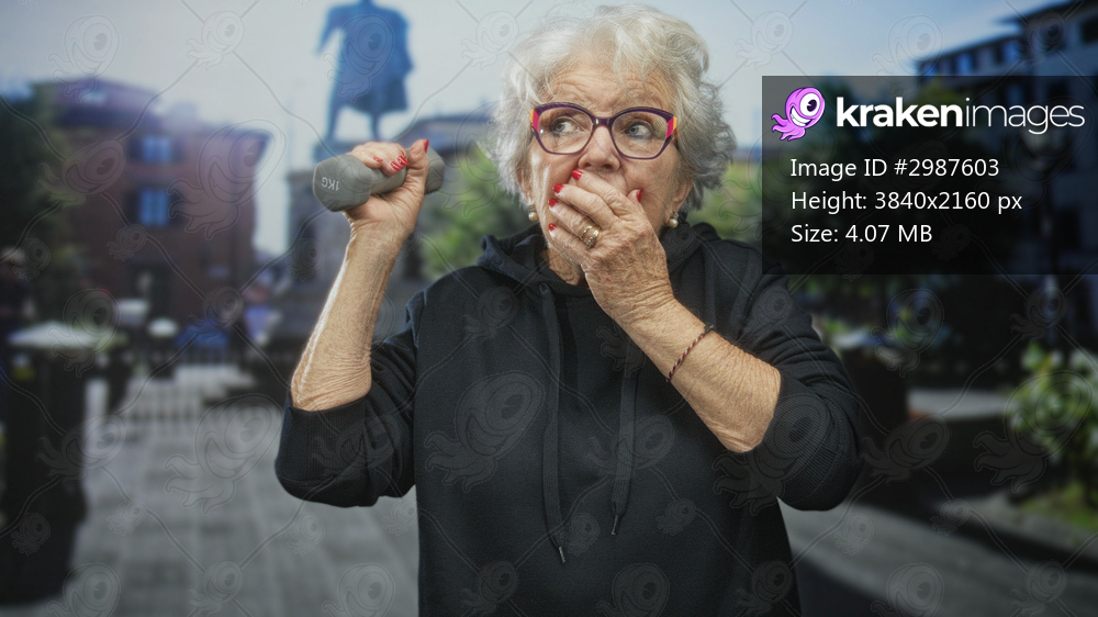 Senior woman wearing glasses and hoodie holds dumbbell in one hand and covers mouth on a street plaza; surprise resilience.
