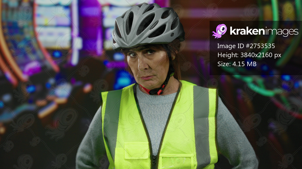 Senior woman wearing helmet in a casino setting with slot machines visible and a safety vest highlighting her presence indoors under bright lights suggesting a lively atmosphere. - Kraken Images