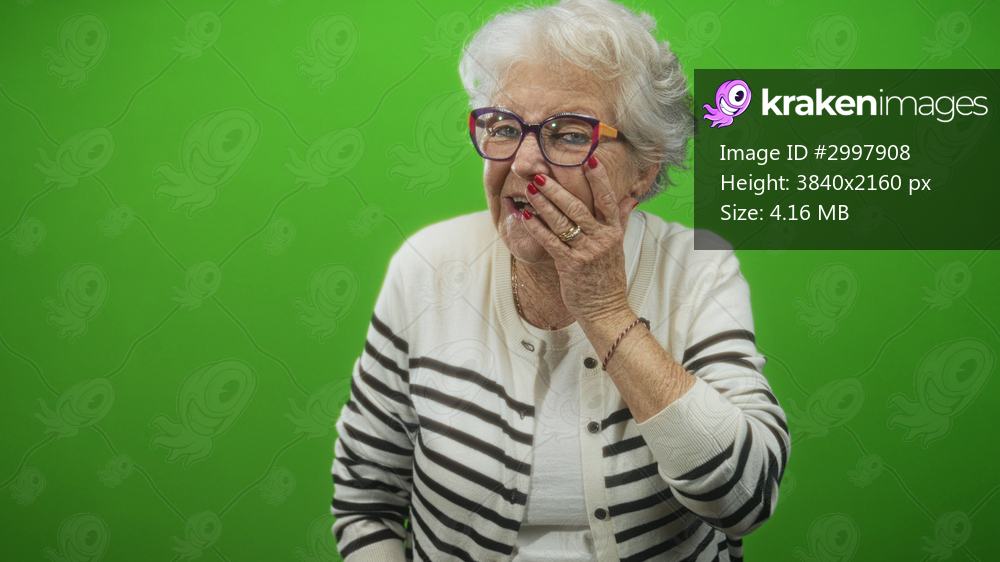 Senior woman wearing striped cardigan and glasses covers mouth with hand against green studio backdrop; surprise.