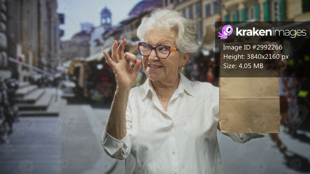 Senior woman wearing white blouse and colorful glasses holds paper bag and makes thumbs up gesture on a street market; cheerful approval warmth.