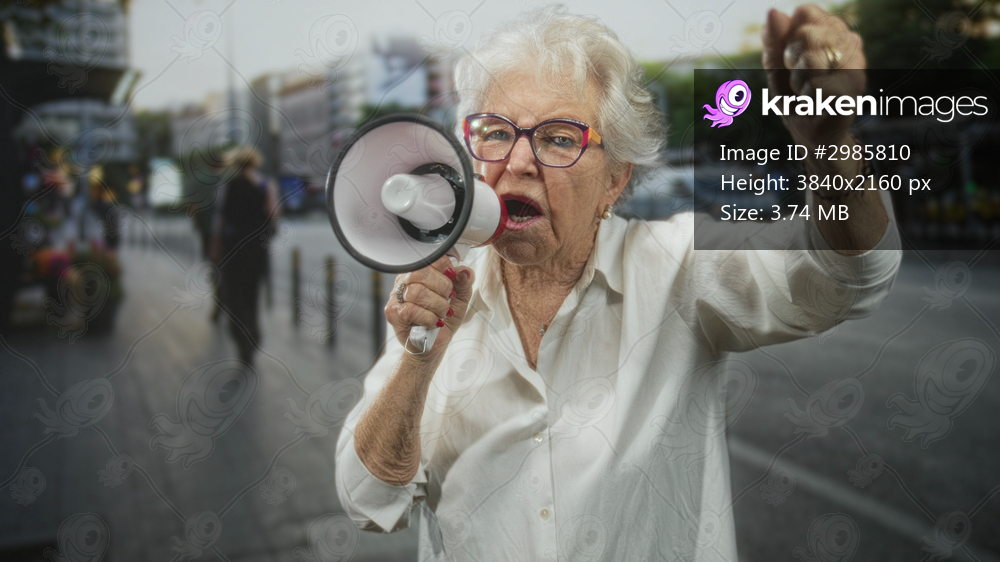 Senior woman wearing white blouse and glasses shouts into megaphone and raises fist on a busy city street; defiance protest.