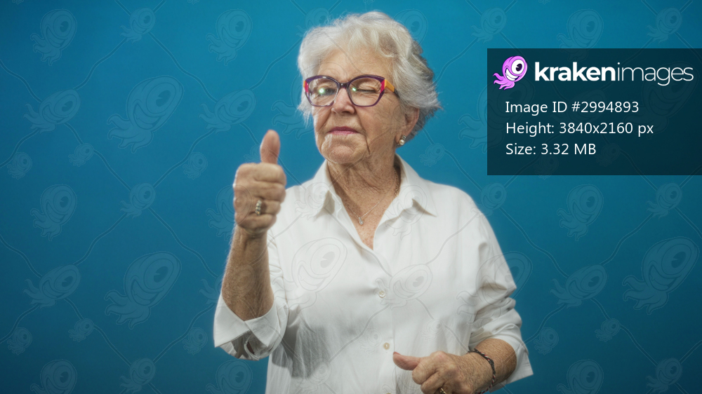 Senior woman wearing white shirt and colorful glasses giving thumbs up gesture showing thumb and hand in a blue studio set; confidence approval.