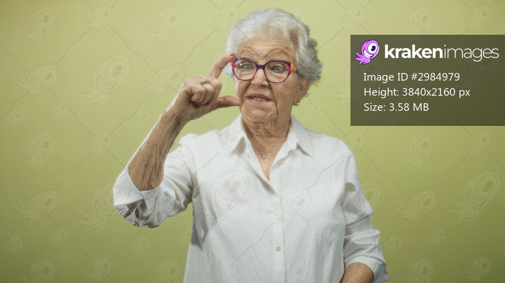 Senior woman wearing white shirt pinches thumb and forefinger near eyeglasses in studio; gentle patience.