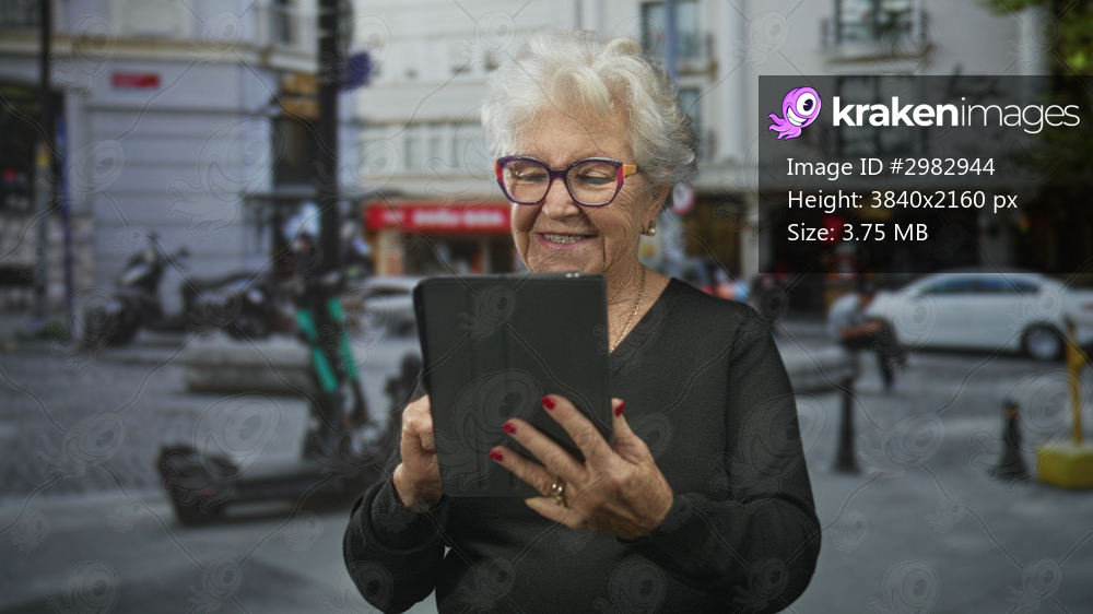 Senior woman with white hair and glasses tapping a tablet screen with finger while standing on a busy urban street near scooters and parked cars and storefronts; curiosity. - Kraken Images