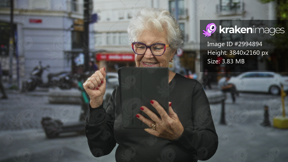 Senior woman with white hair and glasses tapping a tablet screen with finger while standing on a busy urban street near scooters and parked cars and storefronts; curiosity. - Kraken Images