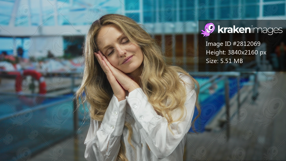 Serene woman presses hands near cheek in a sleeping pose aboard boat as young blonde traveler on cruise enjoys outdoors vacation relaxation.