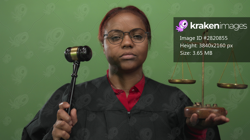 Serious african american judge holds gavel and scales in green studio setting with eyes closed; authority.