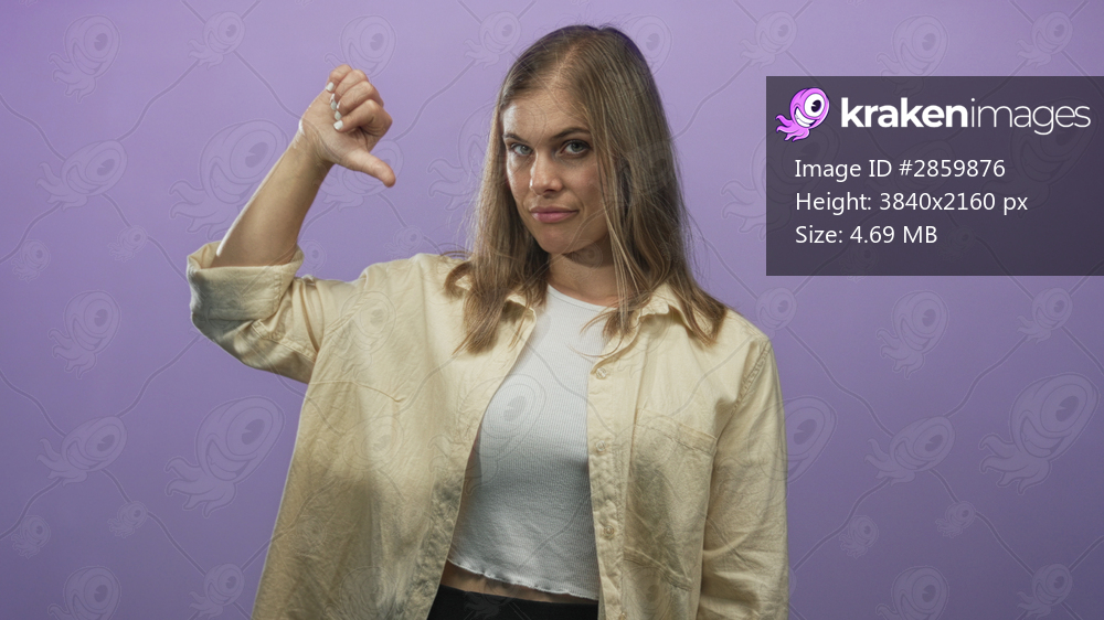 Serious confident upright young blonde woman standing pointing finger in studio; disapproval negativity.