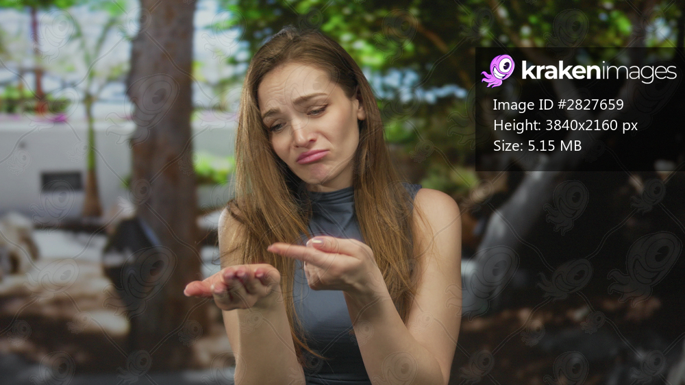 Serious young woman holding palms up begging gesture in forest clearing under daylight; desperation.