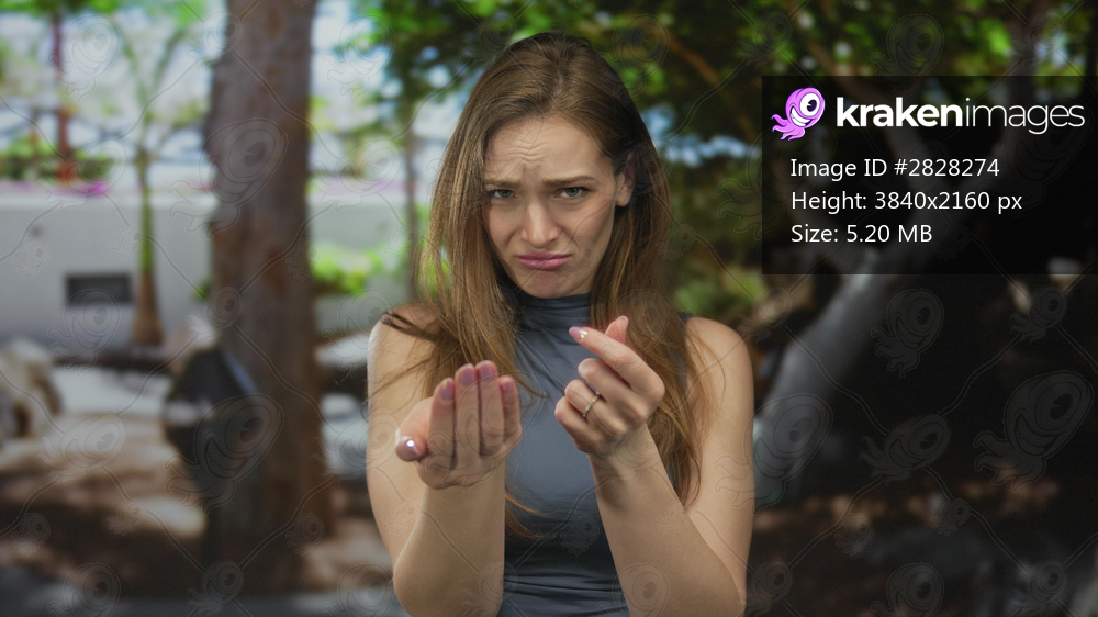 Serious young woman holding palms up begging gesture in forest clearing under daylight; desperation.