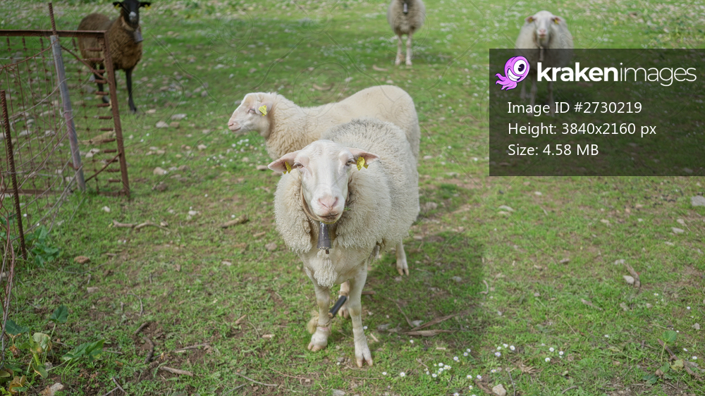 Sheep grazing in a lush green pasture with a backdrop of iron fencing and scattered wildflowers under clear skies.