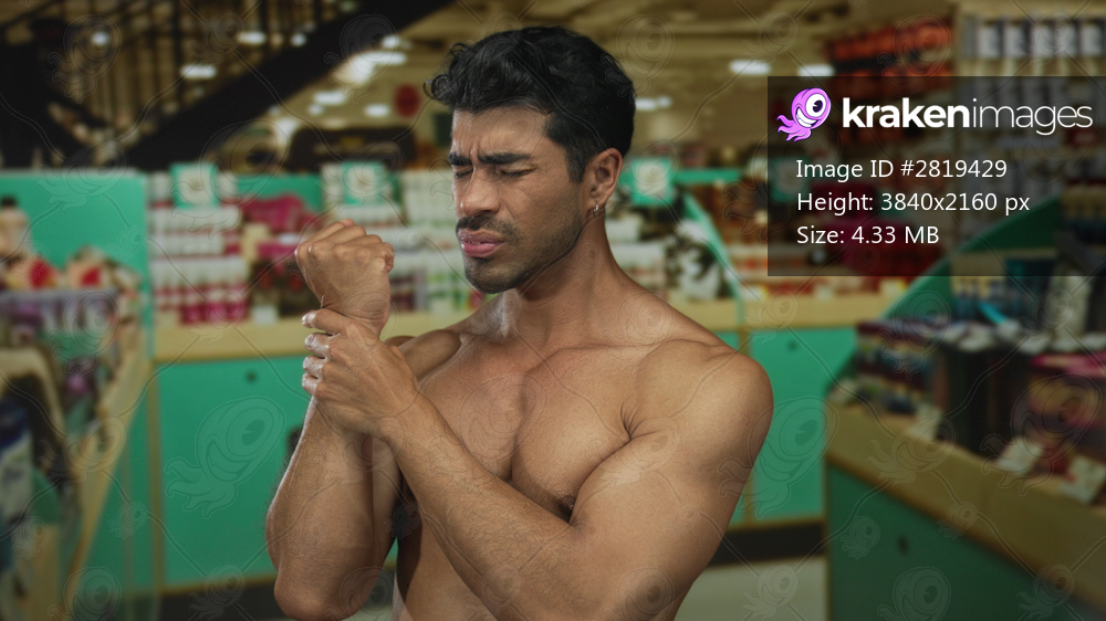 Shirtless hispanic man grips wrist in building aisle lined with colorful merchandise under fluorescent lights; discomfort.