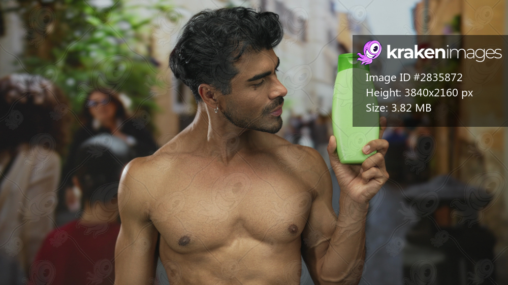 Shirtless hispanic man holds green bottle near his bare chest on a bustling city street filled with blurred pedestrians; confidence vitality wellness energy. - Kraken Images