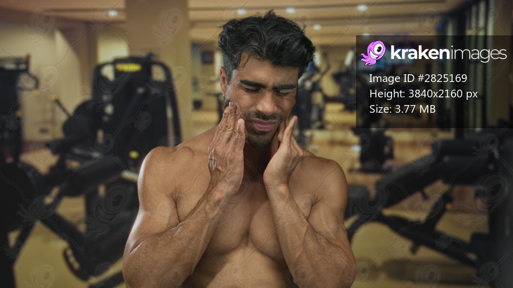 Shirtless man grimacing heavily with hand on cheek for toothache in gymnasium building; physical discomfort.