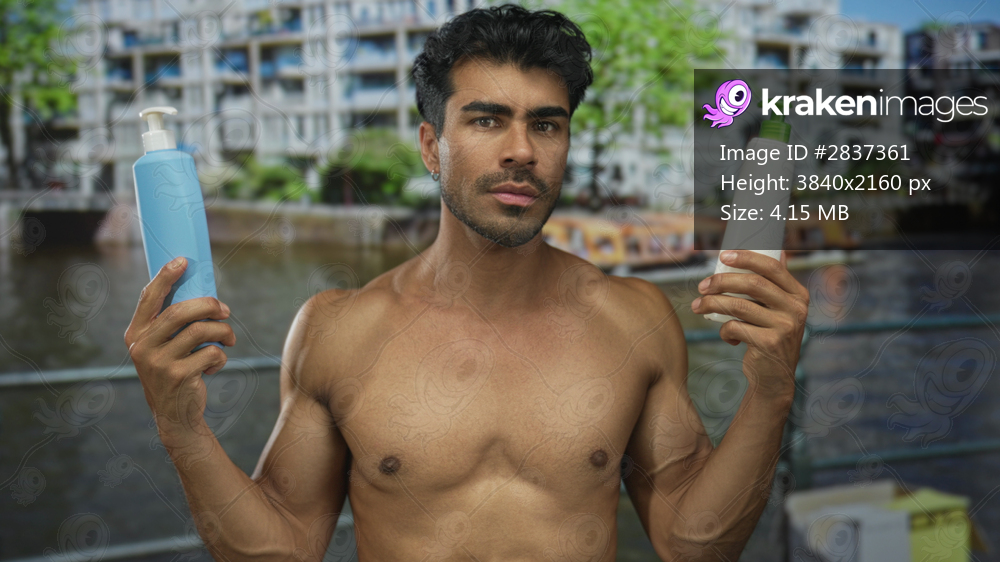 Shirtless man holds two lotion bottles on street next to canal building; selfcare serenity balance.