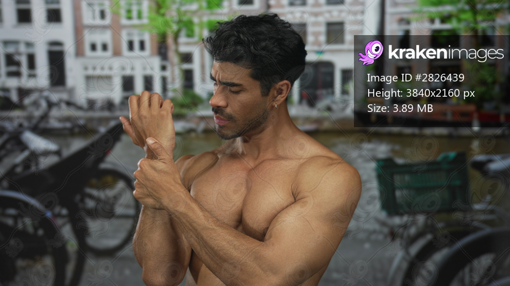 Shirtless man holds wrist on street while inspecting pain with muscles tensing by canal edge; resilience determination strength endurance.