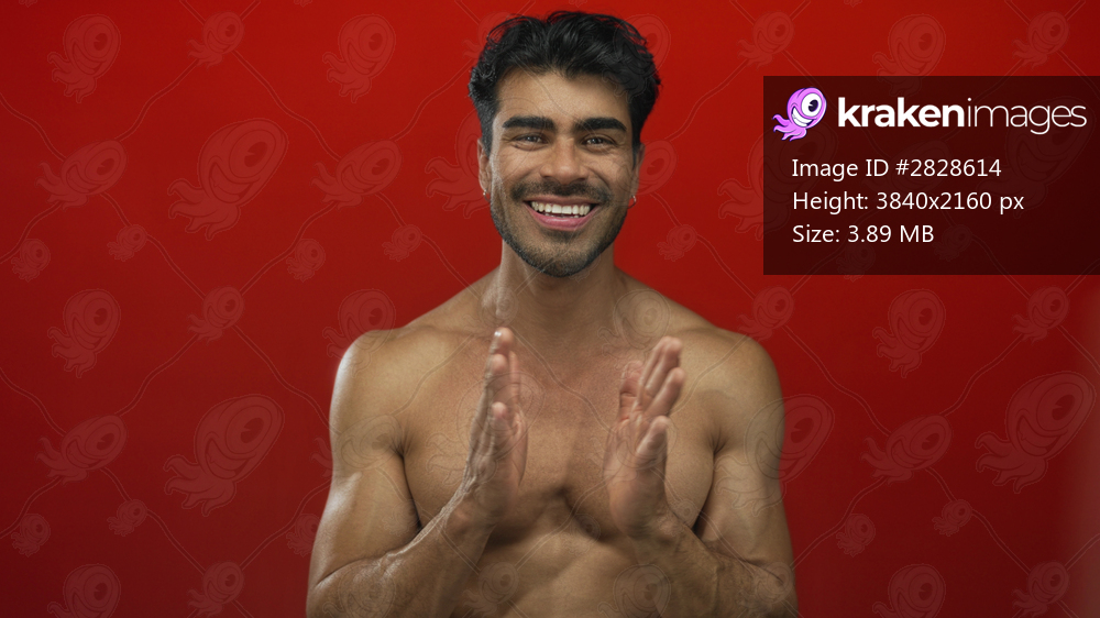 Shirtless man with muscular chest claps bare hands and smiles in bright red studio; joy energy enthusiasm.