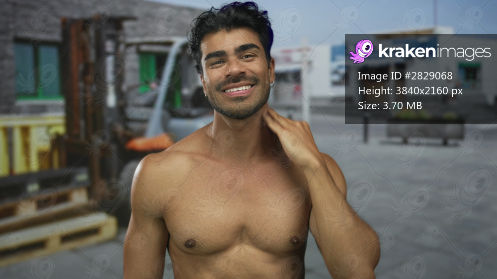Shirtless man with muscular chest smiles and scratches head next to a forklift in front of a building on a sunny day; joy.