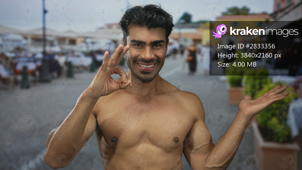 Shirtless smiling young hispanic man making ok sign with raised hand and bare chest on street; approval.