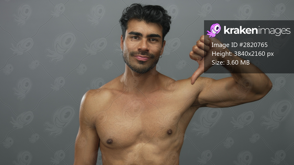 Shirtless young hispanic man with bare chest and smirk shows thumbs down gesture in grey studio; rejection.