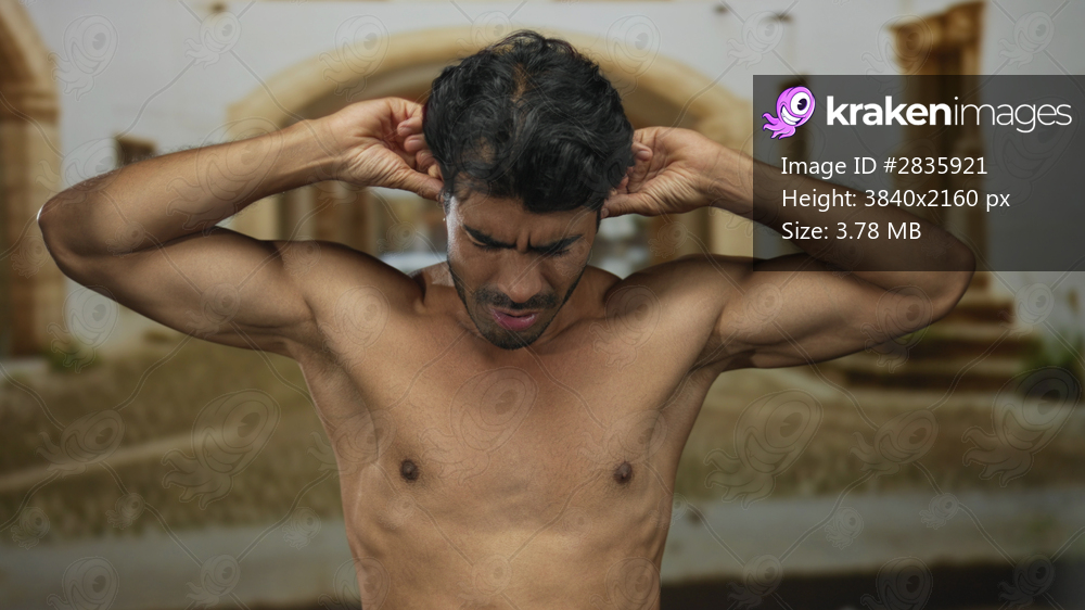 Shirtless young hispanic man covering ears on deserted street lined with old stone buildings; discomfort.