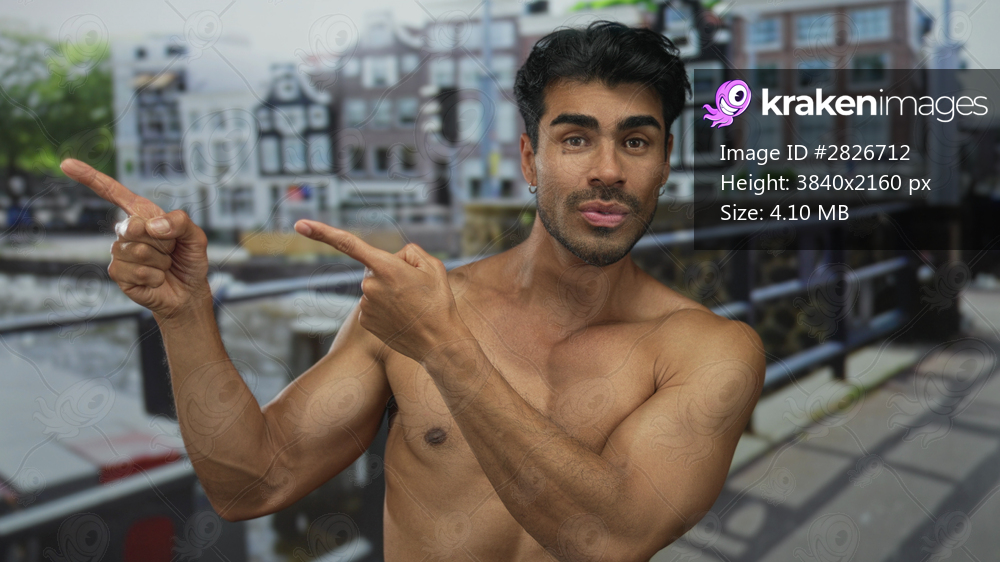 Shirtless young hispanic man points both index fingers with bare chest on city street by canal railing; confidence.