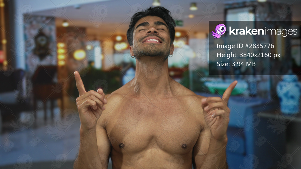 Shirtless young hispanic man tilts his head back and points both index fingers upward in building hall; joy optimism.