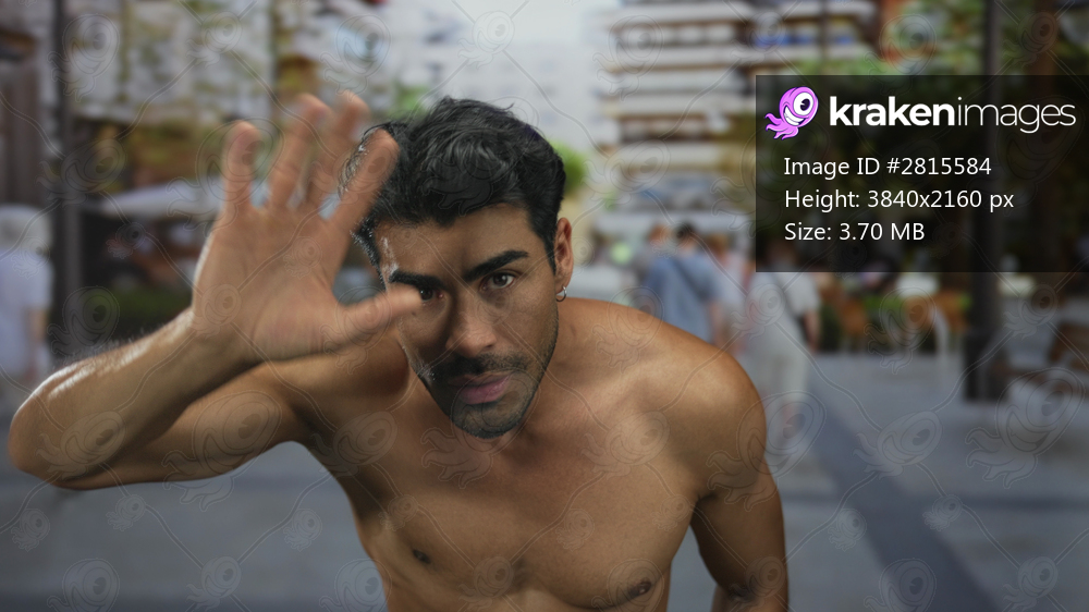 Shirtless young hispanic man waves muscular arm amid sunlit crowded city street scene; friendly welcome.