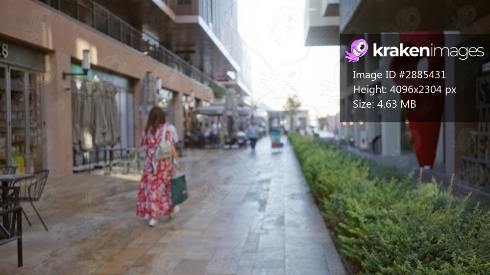 Shopping plaza walkway with blurred shallow bokeh focus and soft defocused storefronts, outdoor; background backplate copyspace calm.