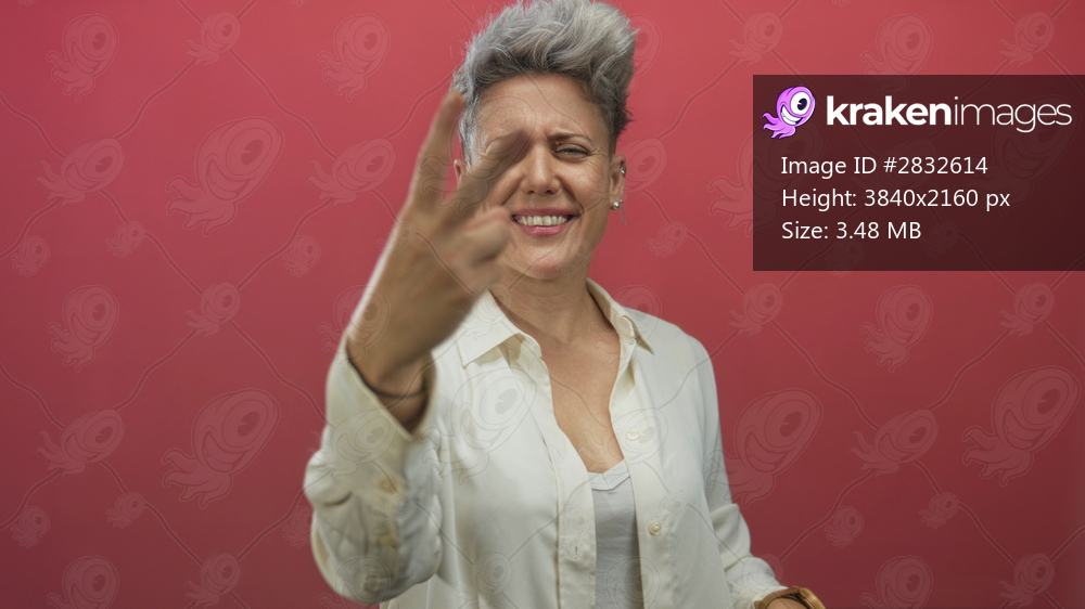 Short hair caucasian woman energetically smiling clenches fists against red studio wall; victory celebration.