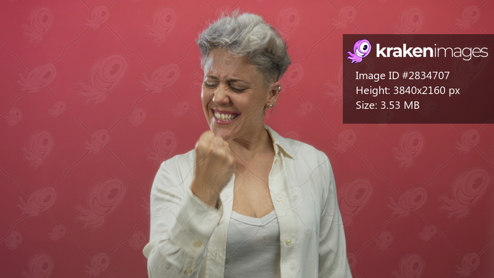 Short hair caucasian woman energetically smiling clenches fists against red studio wall; victory celebration.